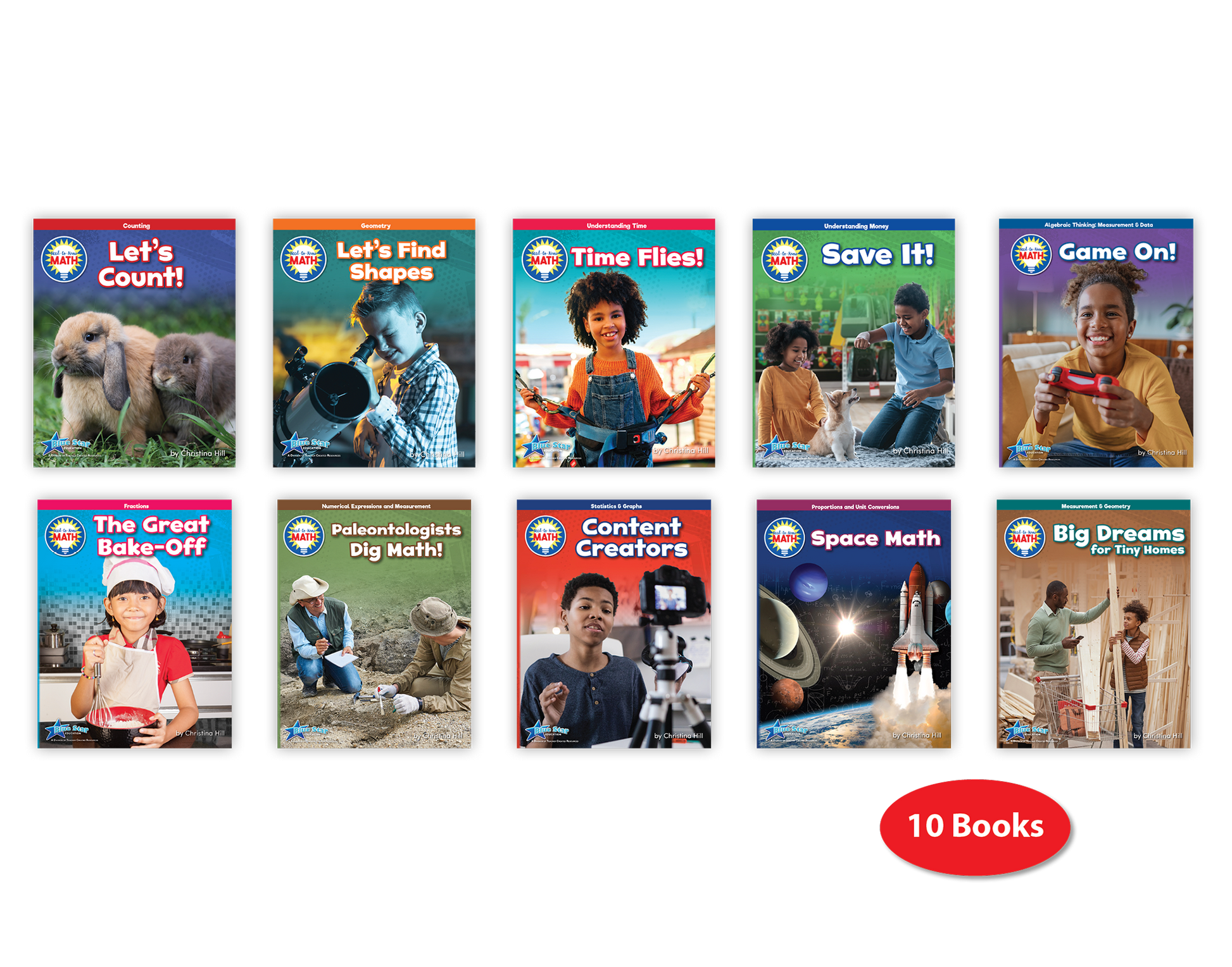 Build math understanding through engaging, intentional reading with this math book room set. Each book supports standards-aligned math concepts and combines direct math instruction with storytelling, to bring abstract math concepts to life. Embedded math problems provide students opportunities to practice their learning as they read. This set includes 6 copies each of 10 books. 60 books total.