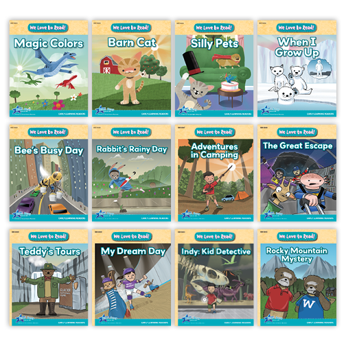 Set includes 12 readers: Magic Colors, Barn Cat, Silly Pets, When I Grow Up, Bee’s Busy Day, Rabbit’s Rainy Day, Adventures in Camping, The Great Escape, Teddy’s Tours, My Dream Day, Indy: Kid Detective, and Rocky Mountain Mystery